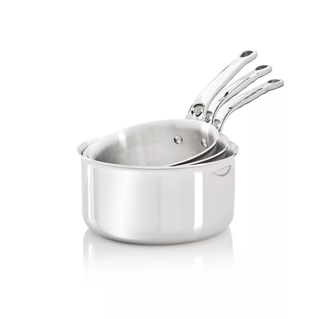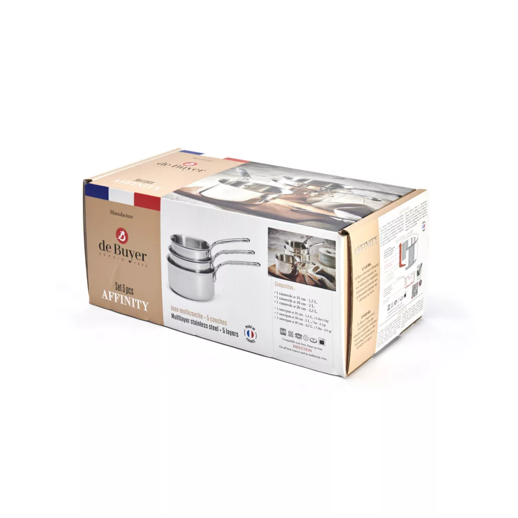 A de Buyer Affinity nyeles lábas készlet kiváló minőségű, többrétegű anyagból készült: kívül rozsdamentes acél, belül alumínium. Ez a kombináció biztosítja a gyors hőmérséklet-emelkedést és az egyenletes hőelosztást. A lábasok kiöntőperemekkel rendelkeznek, így könnyű az adagolás. A szegeselt öntött rozsdamentes acél fogantyúk ergonomikusak és kényelmes fogást biztosítanak. A lábasok modern és elegáns stílusban lettek tervezve, csúcsminőségű tükör polírozással.