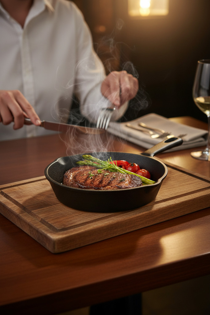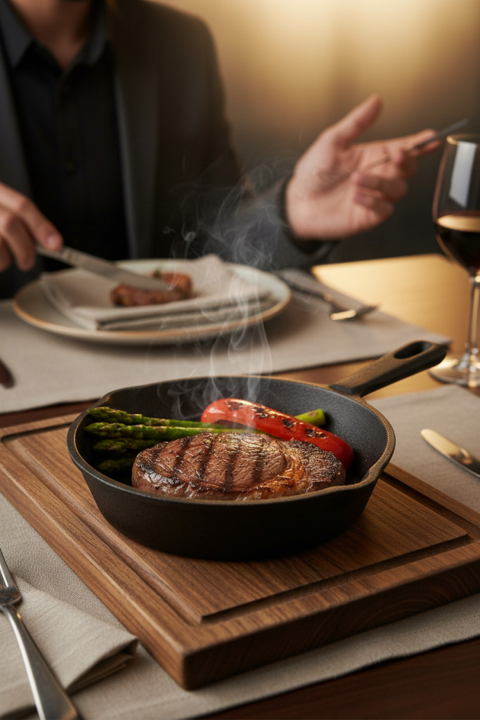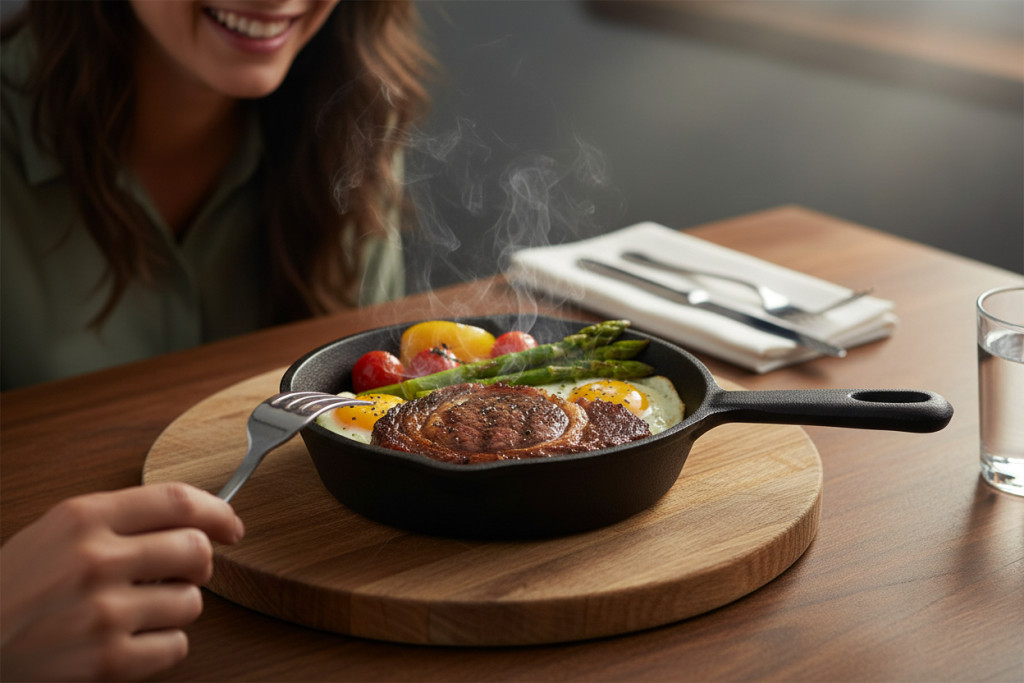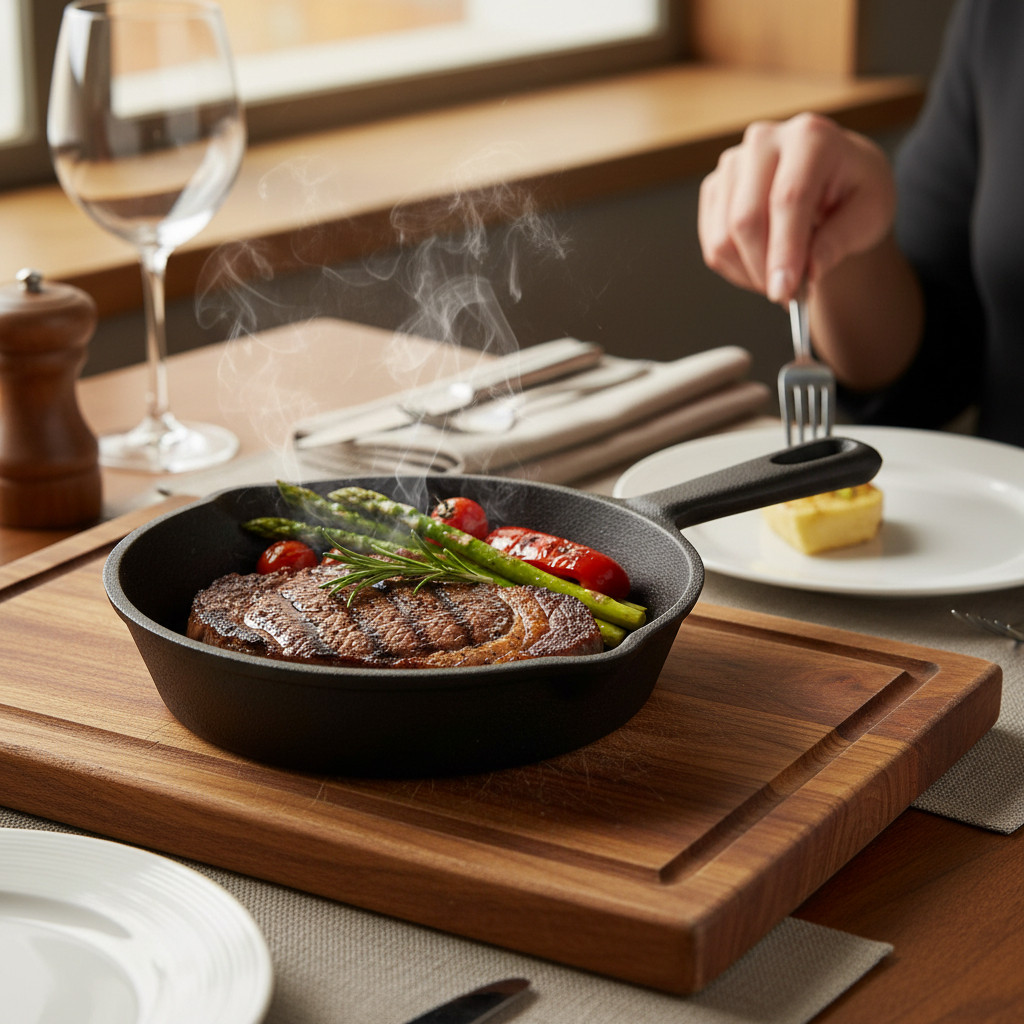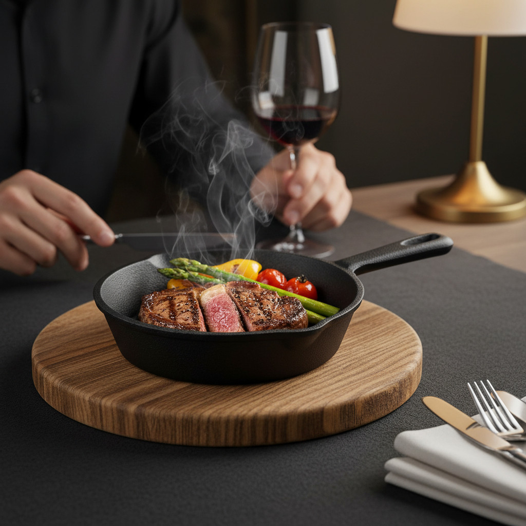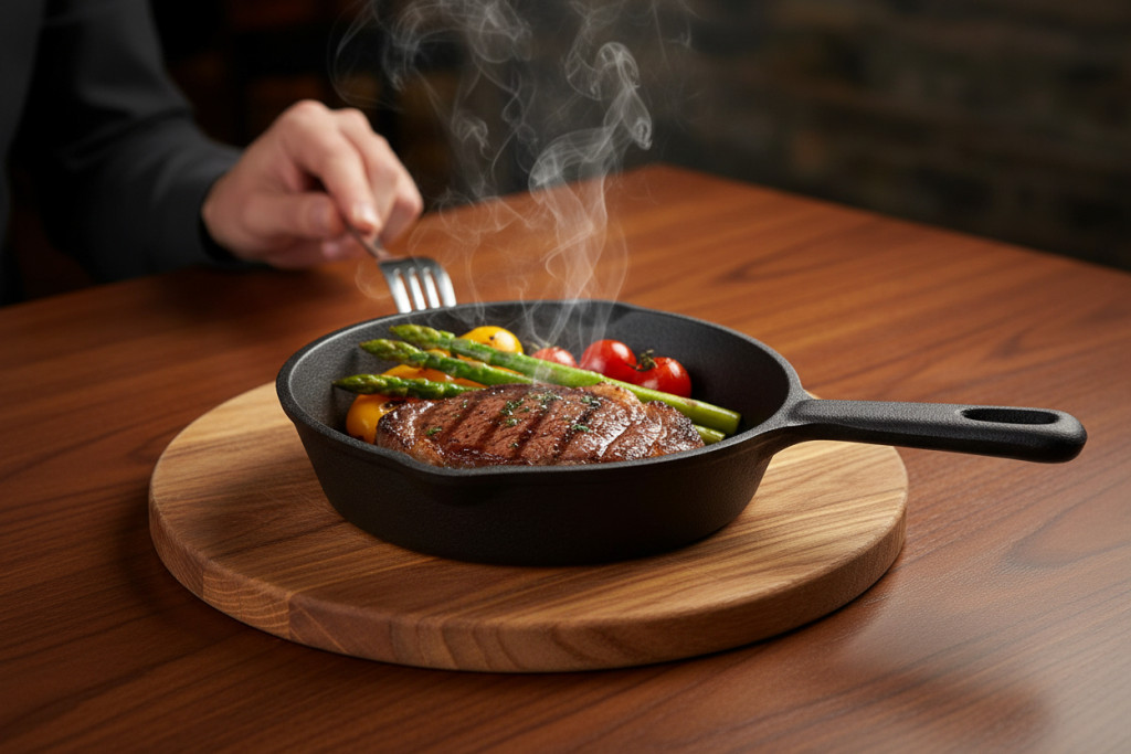 Az öntöttvas anyag kiváló hőtartással rendelkezik, így az étel hosszú ideig meleg marad tálalás közben is. Egyenletesen melegszik fel, és stabil hőt ad le, ami különösen előnyös vendéglátásban és grill jellegű tálalásnál.