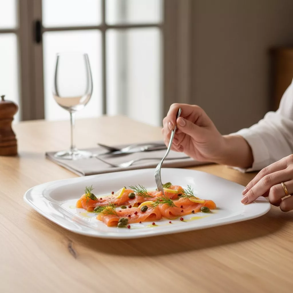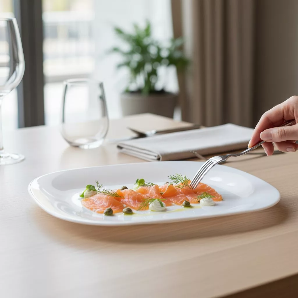 Kiváló például egy füstölt lazac előétel tálalásához, ahol a hosszúkás forma támogatja az elrendezést és kiemeli az alapanyagokat.