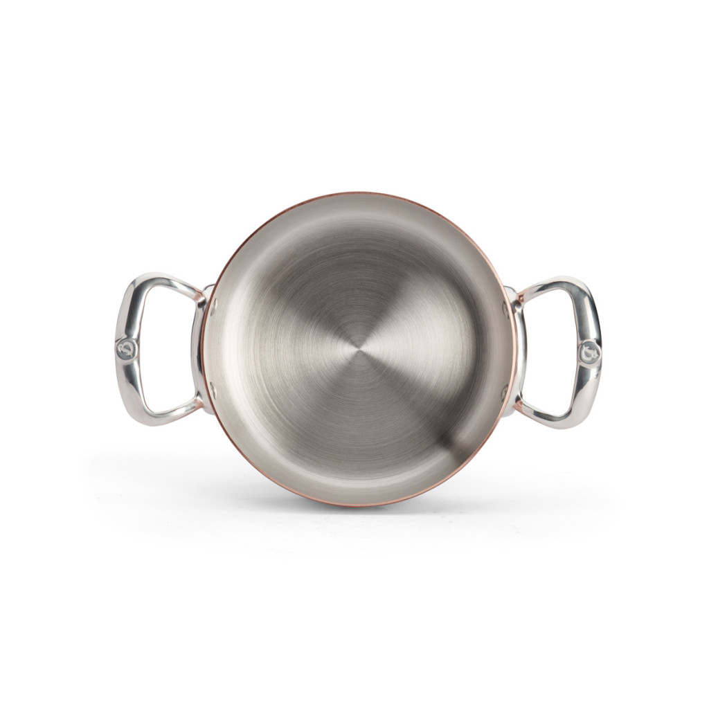 A de Buyer Prima Matera alacsony lábas fedővel egyedülálló kombinációja a réz kiváló hővezető képességének és a rozsdamentes acél praktikusságának. A 27,8 cm felső belső átmérőjű és 4,9 literes űrtartalmú serpenyő 90% rézből és 10% AISI 304 rozsdamentes acélból készült. Az egyenes, alacsony élek ideálisak a nedvesség jó elpárologtatásához és a gyümölcslevek kiváló karamellizálásához. A két szegecselt öntött rozsdamentes acél fogantyú kényelmes és biztonságos használatot biztosít. Az innovatív indukciós alapnak köszönhetően minden főzőlapon, beleértve az indukciót is, használható. A réz ápolásához polírozó paszta ajánlott, a rozsdamentes acél belső rész pedig kézzel mosható. A serpenyő belső magassága 7,9 cm, külső átmérője 28,3 cm, teljes magassága 12,7 cm, teljes hossza 41 cm, az indukciós alap átmérője 25 cm, súlya pedig 3,12 kg.