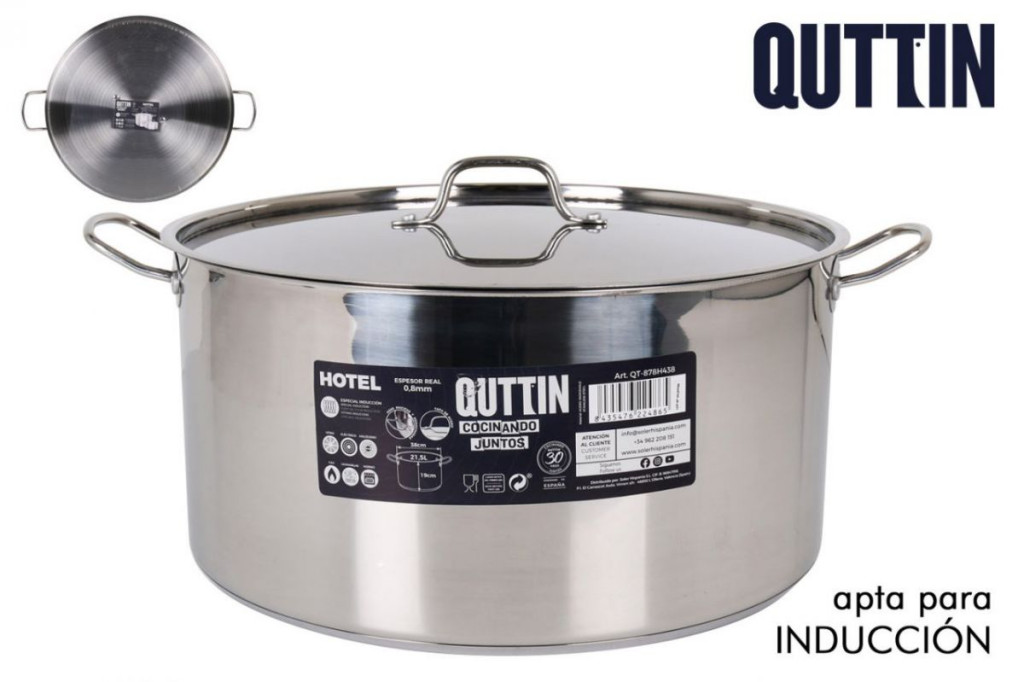 A Quttin Hotel magas lábas fedővel 21,5 literes egy 38 cm átmérőjű, magas falú, 18/10-es rozsdamentes acél edény, amely hatalmas mennyiségek főzésére készült. A 0,8 mm-es falvastagság hosszú élettartamot és stabil hővezetést garantál, míg a vastag szendvics alj egyenletes hőeloszlást biztosít minden főzési felületen – beleértve az indukciót is.