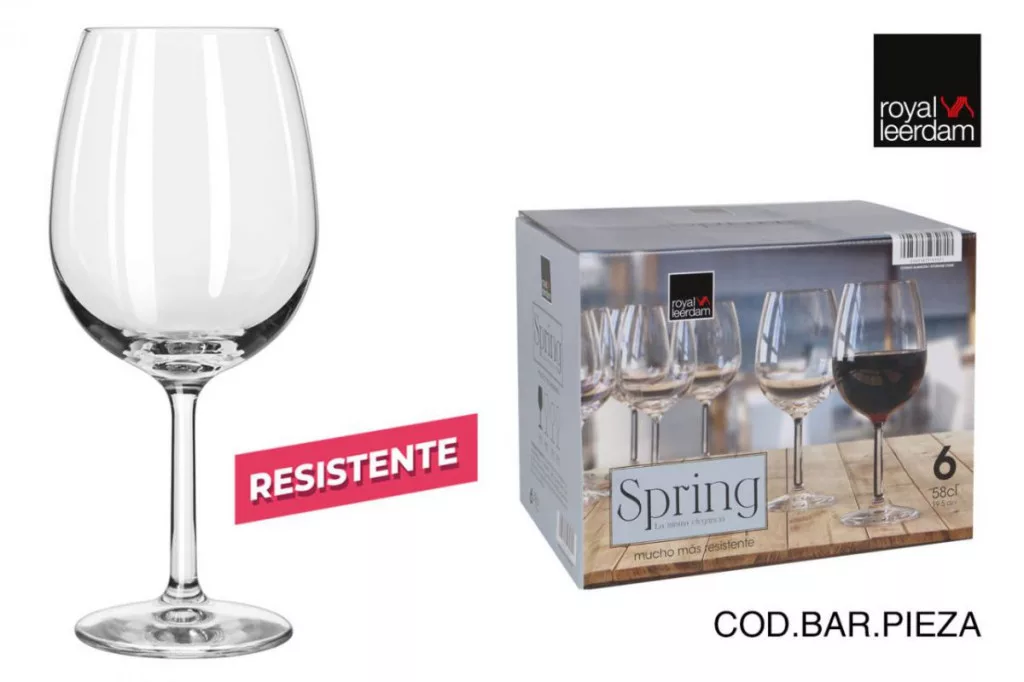 A Royal Leerdam Spring sorozat 580 ml-es vörösboros pohara kifejezetten a teltebb, illatos borok számára készült. A nagy, gömbölyded kehely formája elősegíti az aromák felszabadulását, miközben a karcsú szár biztos fogást ad a bor melegítése nélkül.