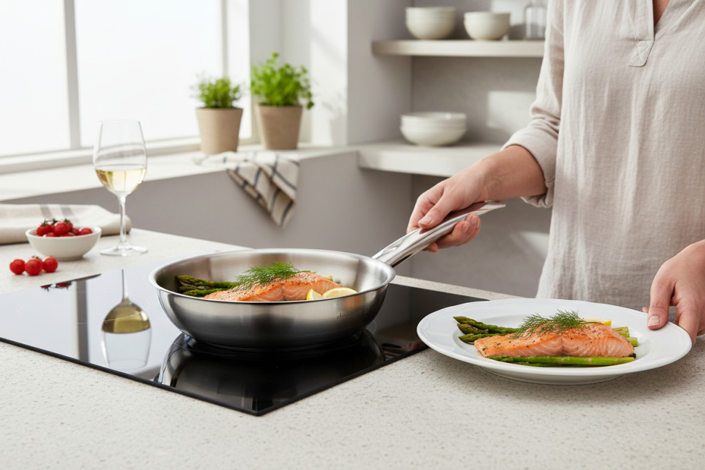Ez a serpenyő rozsdamentes acélból készült, amely ellenáll a korróziónak és a deformációnak. Az egyenletes hőelosztást biztosító alap lehetővé teszi a tökéletes sütést és pirítást, miközben energiát takarít meg.