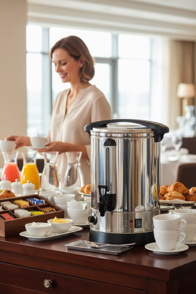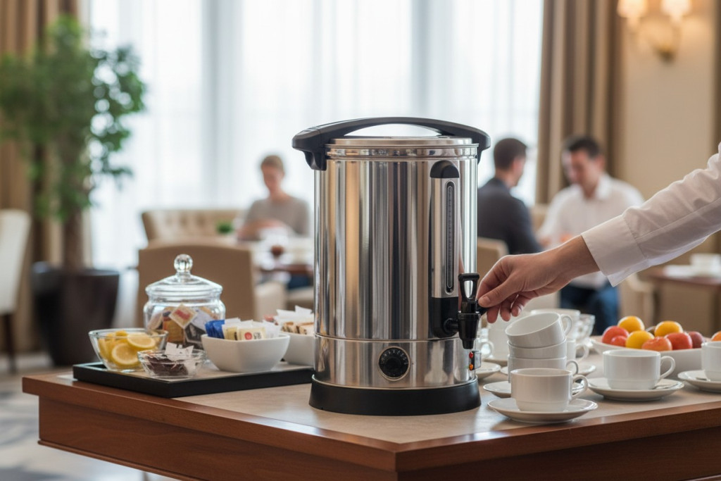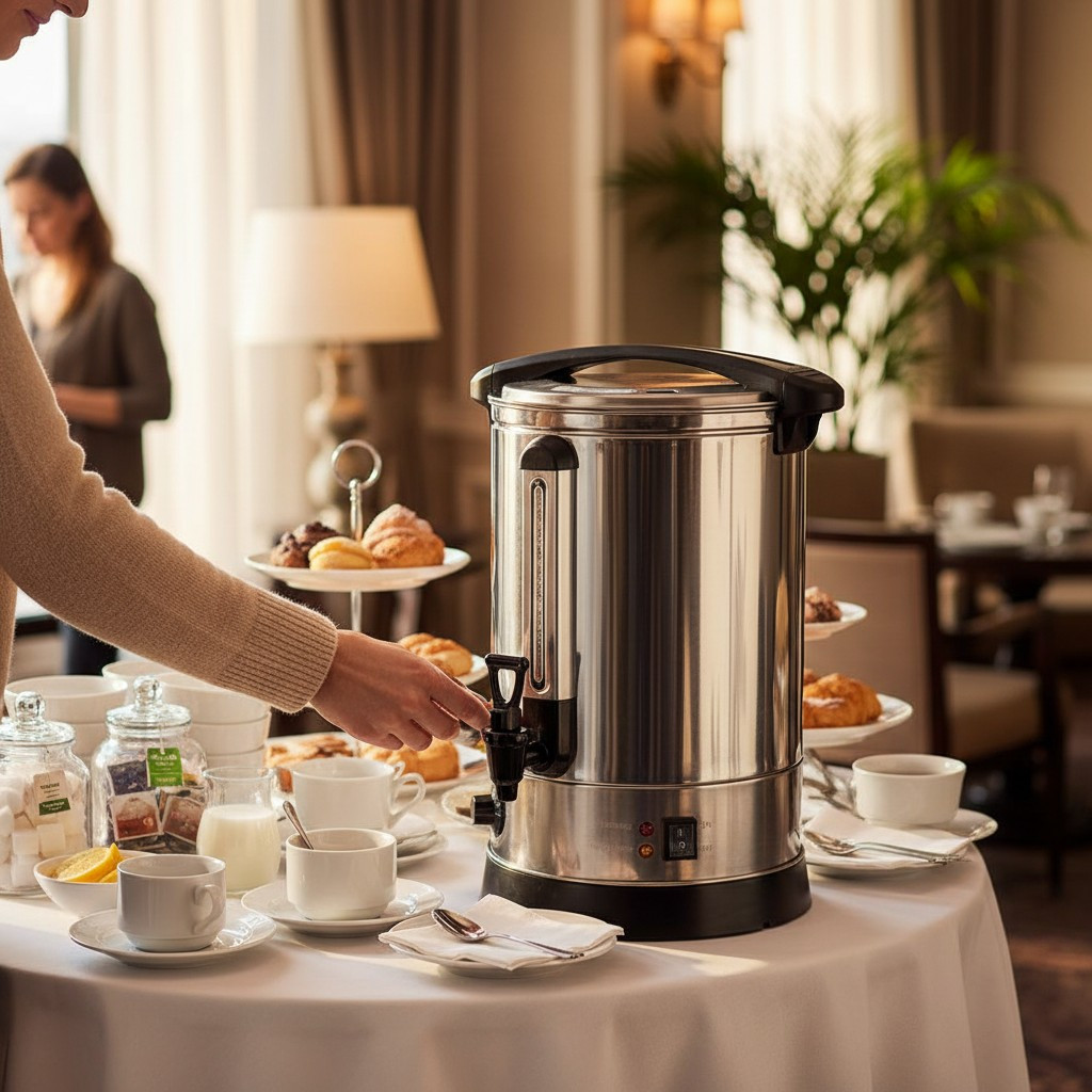 A 10 literes rozsdamentes italmelegentartó adagoló csappal professzionális megoldás forró víz vagy meleg italok előkészítésére és adagolására. Ideális hotelekben, panziókban, svédasztalos reggeliztetésnél, irodákban és kisebb rendezvényeken.