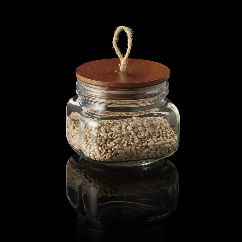 A tégely üveg teste átlátszó, vastag falú, így biztonságos és esztétikus tárolást biztosít. A natúr fa tető természetes hatást kelt, míg a közepén elhelyezett zsinór praktikus fogantyúként is funkcionál – így nem csak zárható, hanem kézre is áll.