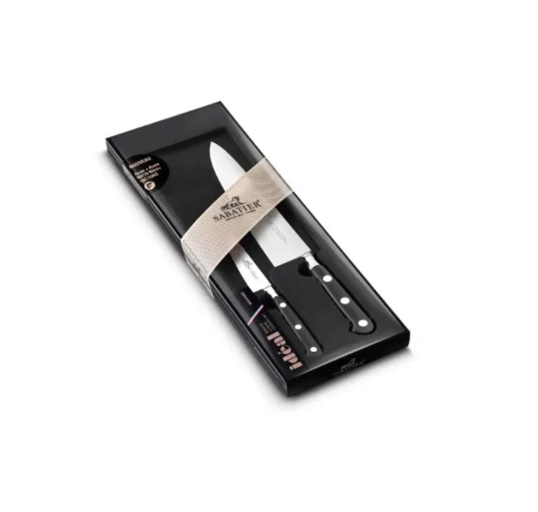 A Sabatier IDEAL kovácsolt konyhai késkészlet két alapvető francia konyhakést tartalmaz: egy 20 cm-es szakácskést és egy 10 cm-es hámozókést. Ez a két kés együtt a legtöbb konyhai feladatra elég, a nagyobb aprítási és szeletelési munkáktól a precíz tisztításig és hámozásig.