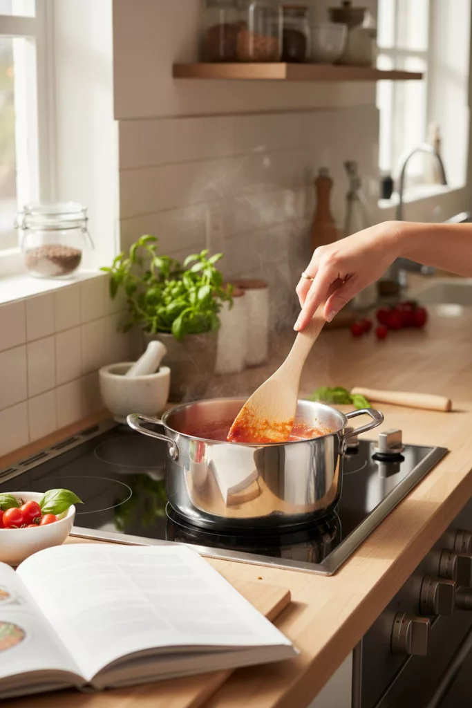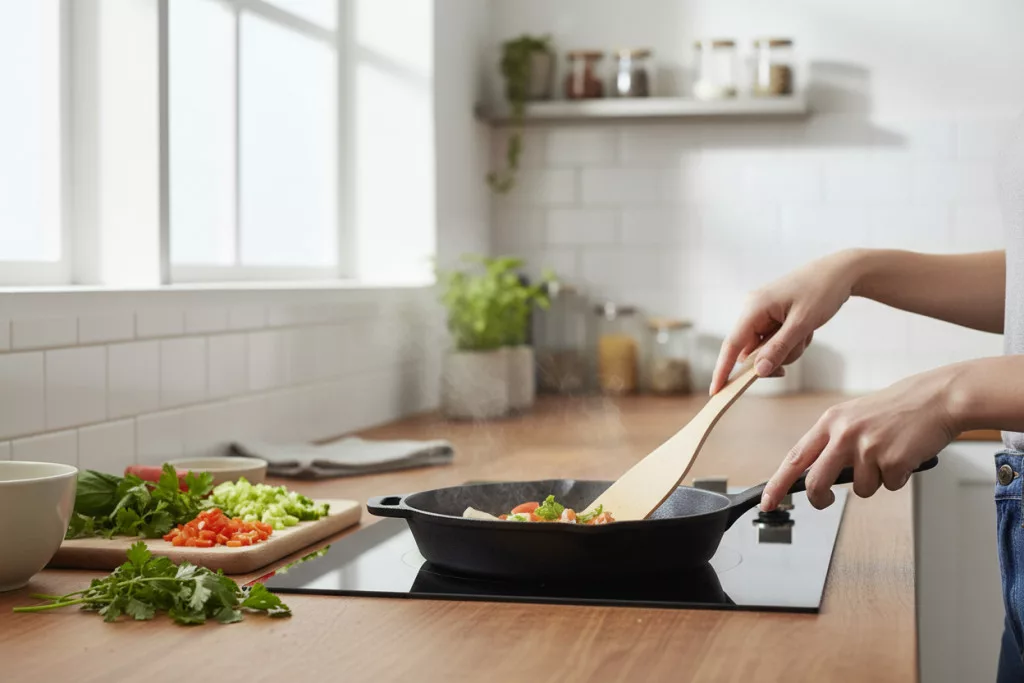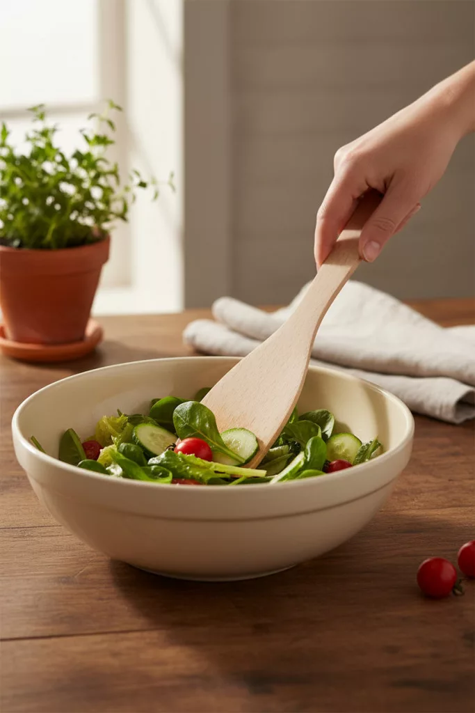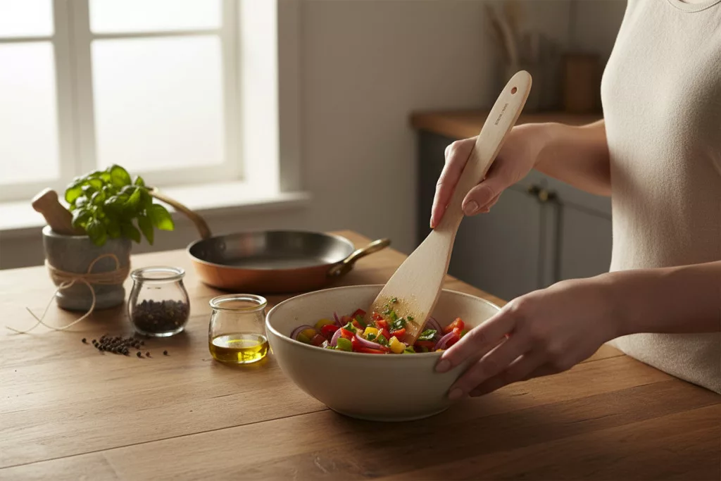 A hajlított kialakítás különösen jól jön sűrűbb krémek, tészták, szószok keverésénél vagy emelésénél, ahol a spatulának követnie kell az edény ívét. Nem „lapátol”, hanem irányít.
