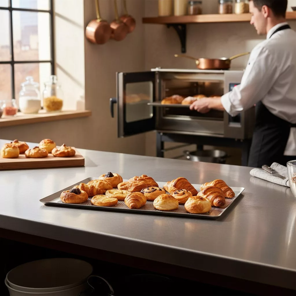 A mikroperforált alumínium felület segíti a meleg levegő áramlását a tészta alatt is, így a sütemények alja nem puhul be, hanem szebben átsül és ropogósabb lesz.