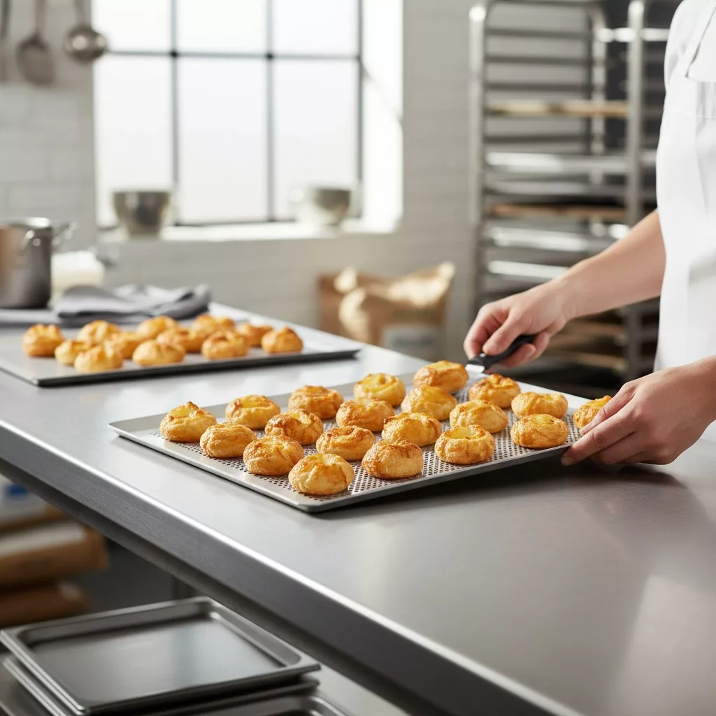 A 40×30 cm-es méret praktikus választás kisebb cukrászati és pékségi munkákhoz, valamint otthoni sütőkbe is jól illeszkedő sütőlemez méret.