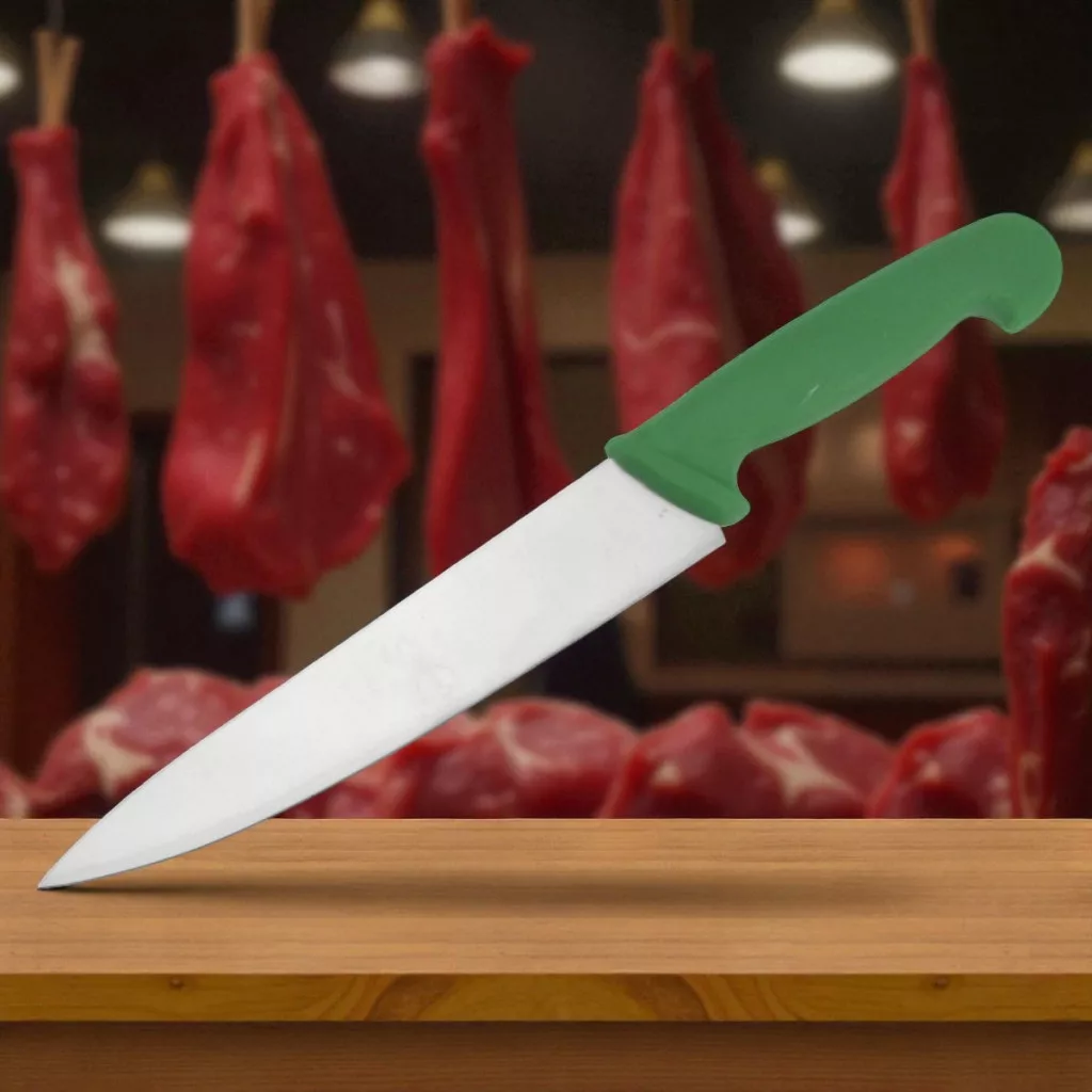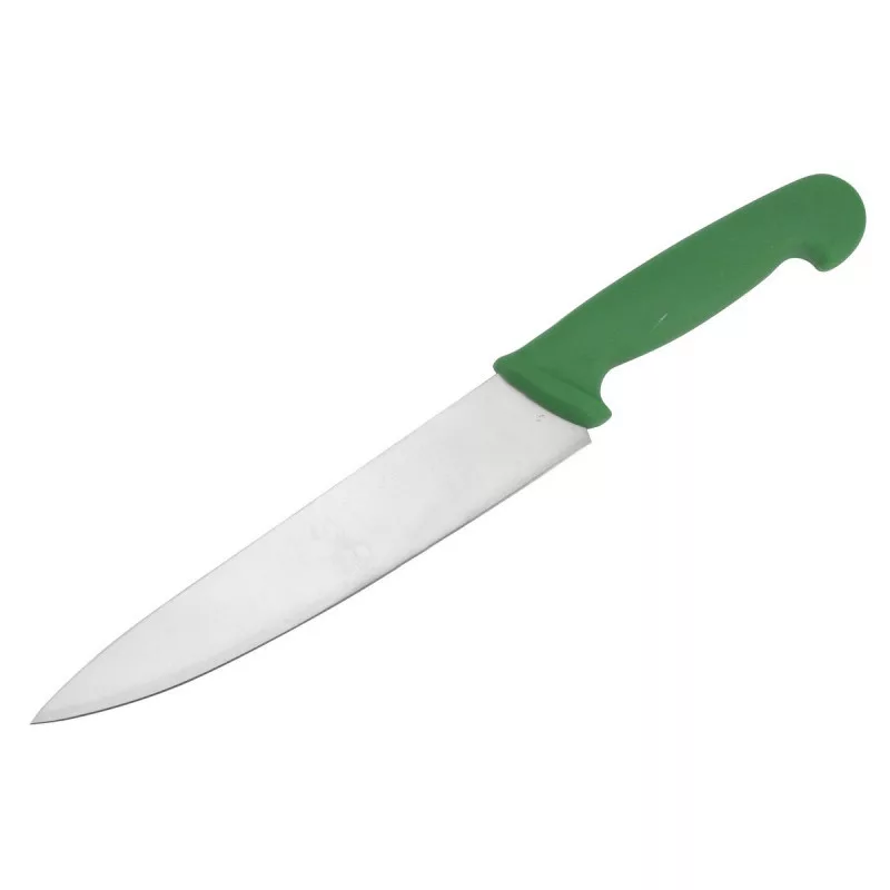 - Zöld, ergonomikus nyél (HACCP színkód): A zöld nyél egyértelműen jelzi a kés felhasználási területét (zöldségek és gyümölcsök), ezzel segítve a HACCP protokoll betartását a konyhában. Az ergonomikus kialakítás kényelmes és biztonságos fogást biztosít, csökkentve a kéz fáradtságát hosszabb ideig tartó használat esetén is. A nyél anyaga tartós, könnyen tisztítható és fertőtleníthető műanyag (érdemes megadni a pontos anyagot, pl. polipropilén, TPE). A sima, hézagmentes felület megakadályozza a szennyeződések megtapadását.