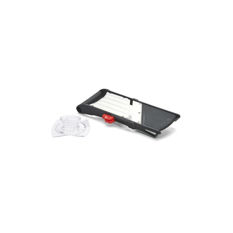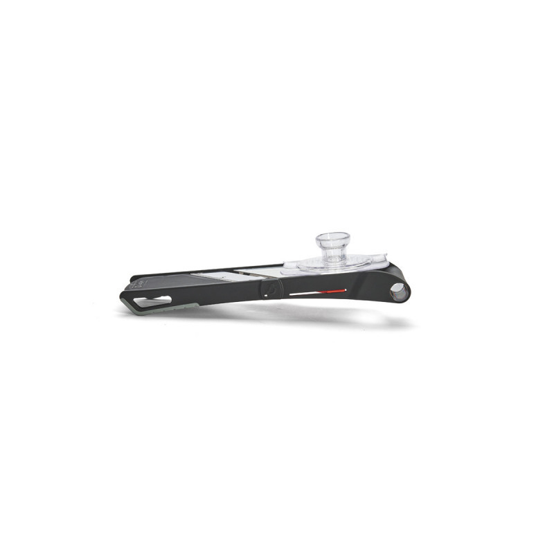 A KOMI szeletelő ergonomikus fogantyúval és gumi csúszásgátló lábakkal rendelkezik, amelyek kényelmes és biztonságos használatot biztosítanak. A mellékelt tolóvédő védi az ujjait szeletelés közben.