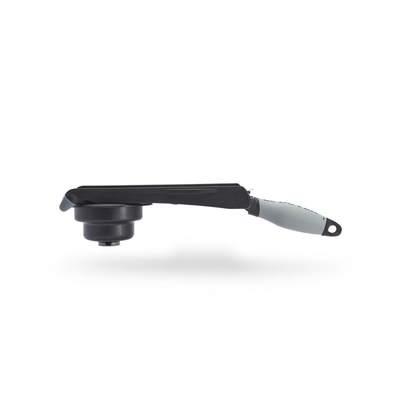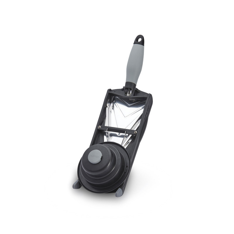 A penge könnyedén behatol az élelmiszerekbe, a mikrofogazatnak köszönhetően pedig a legpuhább gyümölcsöket és zöldségeket is könnyedén szeletelheti anélkül, hogy összetörné őket. Az optimalizált 19,3°-os vágási szög biztosítja a tökéletes vágást. A rozsdamentes acél rámpa lehetővé teszi az élelmiszerek könnyű csúszását, a fogantyú végén található tárcsával pedig egyszerűen állíthatja a vastagságot. Az ergonomikus fogantyú kényelmes fogást biztosít.