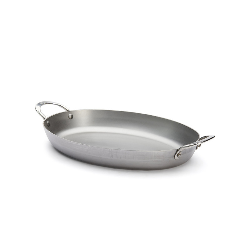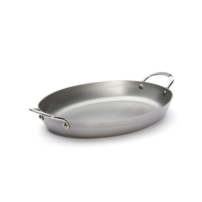 36 cm-es ovális, professzionális minőségű vas szeletsütő két füllel. Ideális nagyobb húsokhoz, halakhoz és zöldségekhez. 100% természetes szénacélból készült, méhviasz bevonattal a tapadásmentességért.