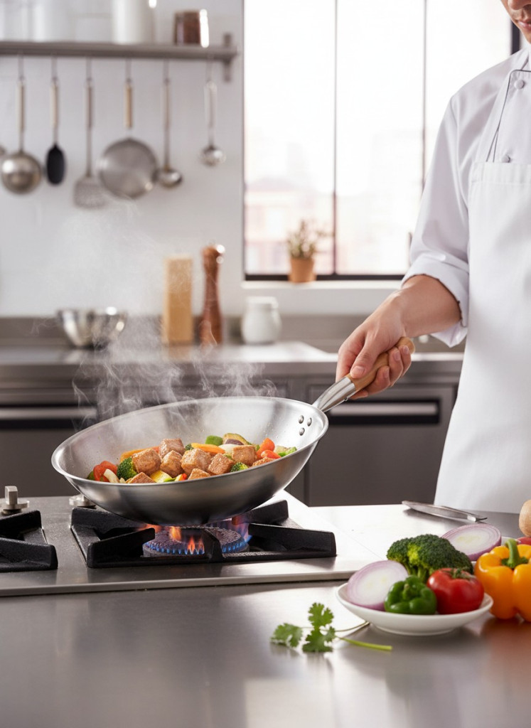 • Forma: Klasszikus wok kialakítás, ideális keveréshez, forgatáshoz.