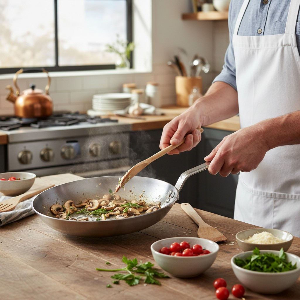 • Első használat előtt: Mossa el a serpenyőt forró vízzel és szappannal, majd alaposan szárítsa meg. Ezután kenje be vékonyan növényi olajjal, és hevítse fel, amíg enyhén füstölni nem kezd. Hagyja kihűlni, majd törölje ki az olajat. Ezt a folyamatot "beavatásnak" nevezik, és fontos a serpenyő megfelelő használatához.