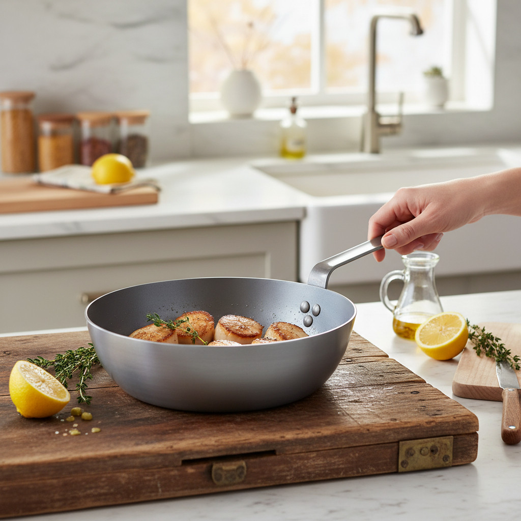 • Kiváló hővezetés: A szénacél kiváló hővezető képessége biztosítja, hogy az étel egyenletesen süljön meg, így elkerülheti az égést és a nyers részeket. A hő egyenletesen oszlik el a serpenyő teljes felületén.