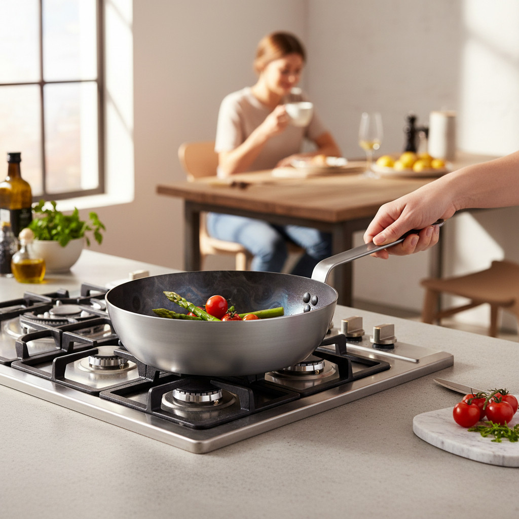• 100% természetes anyagok: A serpenyő 100%-ban természetes szénacélból készül, amely tartós és környezetbarát választás. Nem tartalmaz semmilyen káros vegyi anyagot vagy bevonatot.
