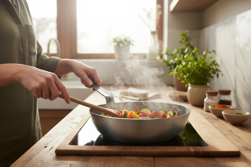 • Első használat előtt: Mossa el a serpenyőt forró vízzel és szappannal, majd alaposan szárítsa meg. Ezután kenje be vékonyan növényi olajjal, és hevítse fel, amíg enyhén füstölni nem kezd. Hagyja kihűlni, majd törölje ki az olajat. Ezt a folyamatot "beavatásnak" nevezik, és fontos a serpenyő megfelelő használatához.