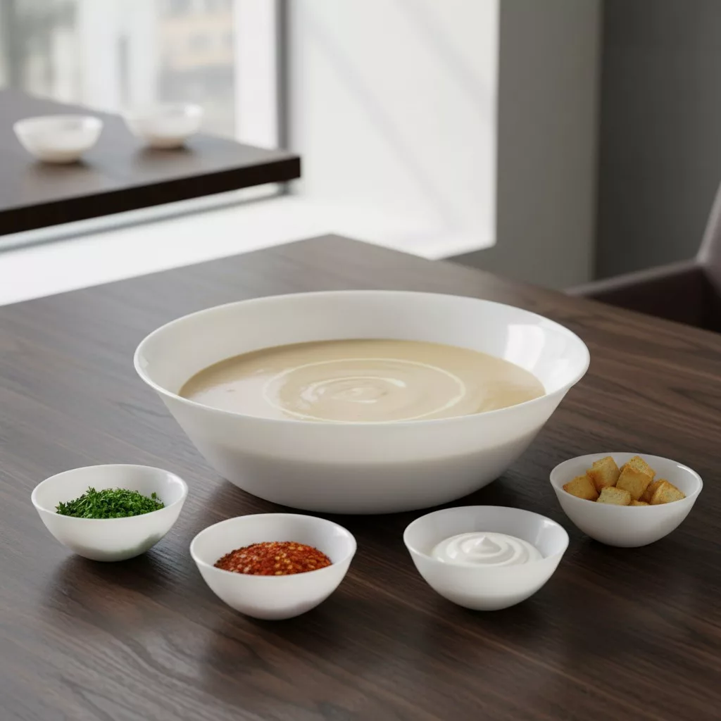 A 23 cm-es méret jól működik például egy krémleves vagy egy rizottó tálalásánál, ahol a textúra és a színek kapják a főszerepet.