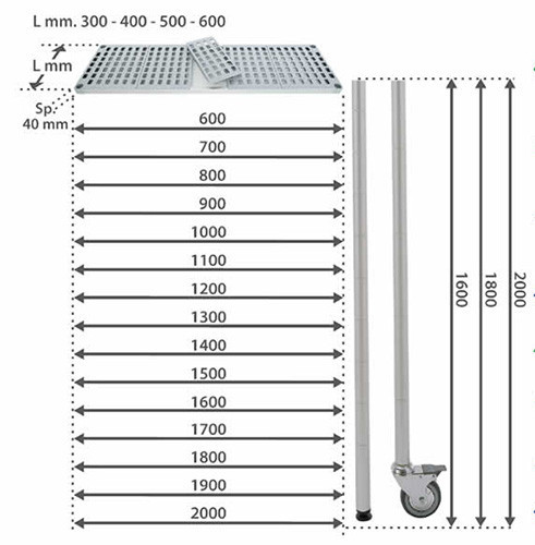 Állítható polcmagasság 10 cm-ként, szintezhető lábak, kiemelhető, ipari mosogatógépben mosható, perforált polcbetétek, OÉTI engedély, tőkehús tárolására alkalmas hűtőkamrában is, hőterhelhetőség: -40°C -tól, 150 kg szintenkénti terhelhetőség, anyag: alumínium lábak és keresztmerevítők, polipropilén polcbetétek, származási hely: Olaszország.