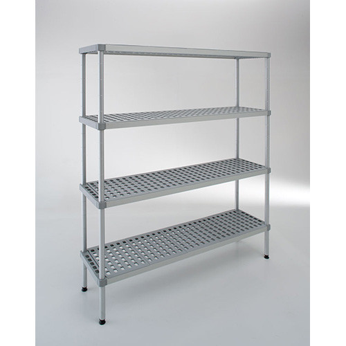 Állítható polcmagasság 10 cm-ként, szintezhető lábak, kiemelhető, ipari mosogatógépben mosható, perforált polcbetétek, OÉTI engedély, tőkehús tárolására alkalmas hűtőkamrában is, hőterhelhetőség: -40°C -tól, 150 kg szintenkénti terhelhetőség, anyag: alumínium lábak és keresztmerevítők, polipropilén polcbetétek, származási hely: Olaszország.