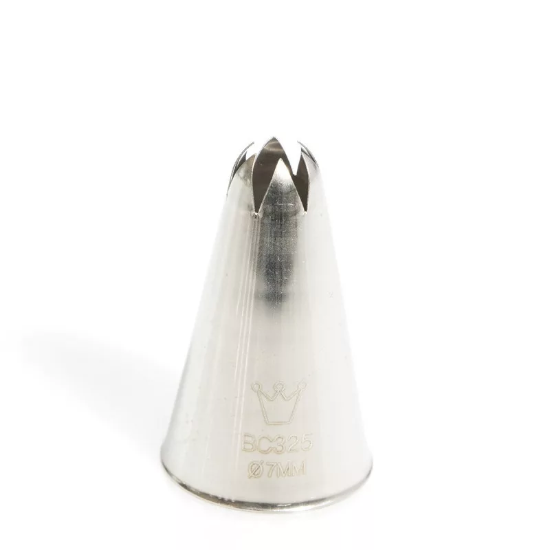 Zárt csillagcső 7 mmRozsdamentes polirozott acél, kerek csillagcső, táskához vagy habzsákhoz, 2-24 mm-es kimeneti lyuk átmérővel. Torták, sütemények, kekszek habbal, krémmel való dekorálására használt eszköz. A névben szereplő átmérő a kimeneti nyílásra vonatkozik. Élelmiszerbiztonságos termék. Megfelelőségi nyilatkozattal rendelkező cukrászati termék. Olasz gyártású cukrászati eszköz. Termék méret: nagy átmérő 35 mm, magasság 50 mm. Első használat előtt alaposan mossa el. Mosogatógépben mosható.