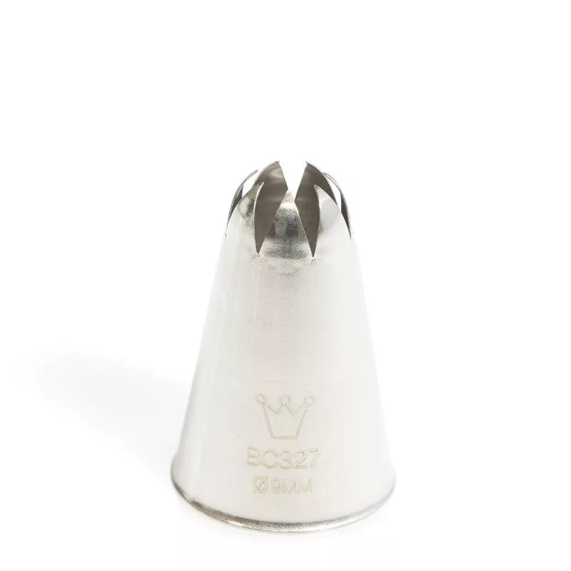 Rozsdamentes polirozott acél, kerek csillagcső, táskához vagy habzsákhoz, 2-24 mm-es kimeneti lyuk átmérővel. Torták, sütemények, kekszek habbal, krémmel való dekorálására használt eszköz. A névben szereplő átmérő a kimeneti nyílásra vonatkozik. Élelmiszerbiztonságos termék. Megfelelőségi nyilatkozattal rendelkező cukrászati termék. Olasz gyártású cukrászati eszköz. Termék méret: nagy átmérő 30 mm, magasság 50 mm. Első használat előtt alaposan mossa el. Mosogatógépben mosható.
