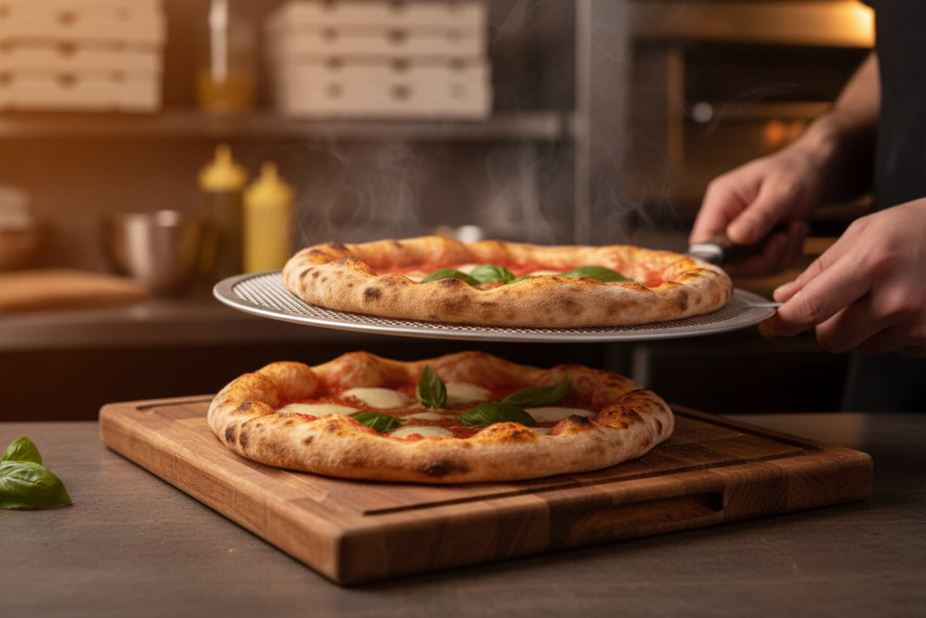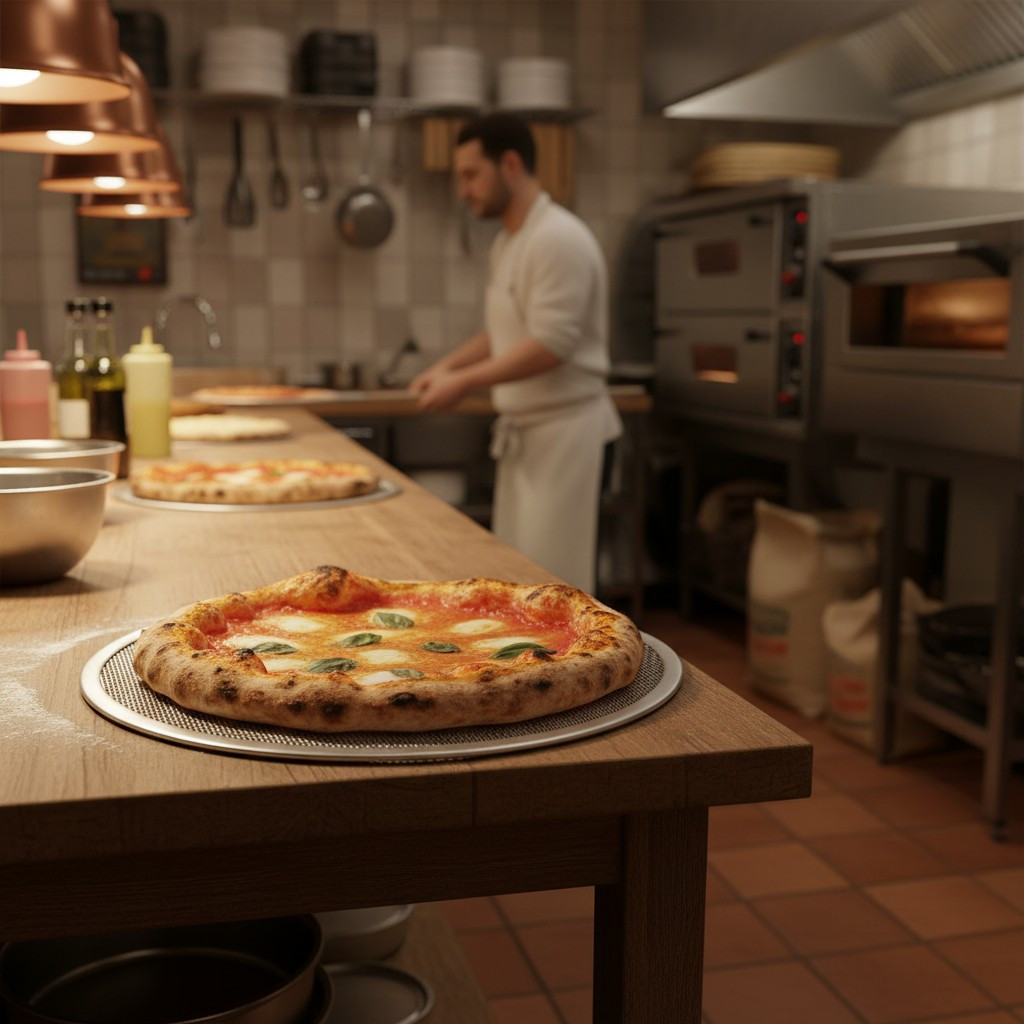 GasztroZoli tipp: Az alumínium perforált pizzasütő rács pizzériákban nagyon gyakori, mert könnyű rajta mozgatni a pizzát, és a perforáció miatt a pizza alja egyenletesen és ropogósra sül.