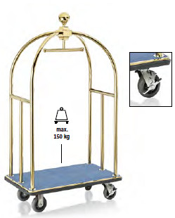 A 3,8 cm-es titán arany csővázzal, gumis lökhárítóval, integrált ruhatartó sínnel és kék szőnyeggel ellátott bőröndszállító elegáns és csendes megoldás a vendégek poggyászának és ruháinak szállítására. A 2 fékezhető és 2 fix 15 cm-es kerék könnyű és biztonságos mozgatást biztosít. Ideális magas színvonalú szállodák és vendéglátóipari egységek számára.
