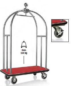 A 3,8 cm-es csiszolt rozsdamentes acél vázzal, gumis lökhárítóval, integrált ruhatartó sínnel és piros szőnyeggel ellátott bőröndszállító elegáns és csendes megoldás a vendégek poggyászának és ruháinak szállítására. A 2 fékezhető és 2 fix 15 cm-es kerék könnyű és biztonságos mozgatást tesz lehetővé. Ideális magas színvonalú, egyedi arculattal rendelkező szállodák és vendéglátóipari egységek számára.