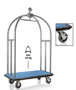 A 3,8 cm-es csiszolt rozsdamentes acél vázzal, gumis lökhárítóval, integrált ruhatartó sínnel és kék szőnyeggel ellátott bőröndszállító elegáns és csendes megoldás a vendégek poggyászának és ruháinak szállítására. A 2 fékezhető és 2 fix 15 cm-es kerék könnyű és biztonságos mozgatást tesz lehetővé. Ideális magas színvonalú szállodák és vendéglátóipari egységek számára.