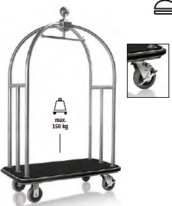 A 3,8 cm-es csiszolt rozsdamentes acél vázzal, gumis lökhárítóval, integrált ruhatartó sínnel és fekete szőnyeggel ellátott bőröndszállító elegáns és csendes megoldás a vendégek poggyászának és ruháinak szállítására. A 2 fékezhető és 2 fix 15 cm-es kerék könnyű és biztonságos mozgatást tesz lehetővé. Ideális magas színvonalú szállodák és vendéglátóipari egységek számára.