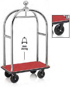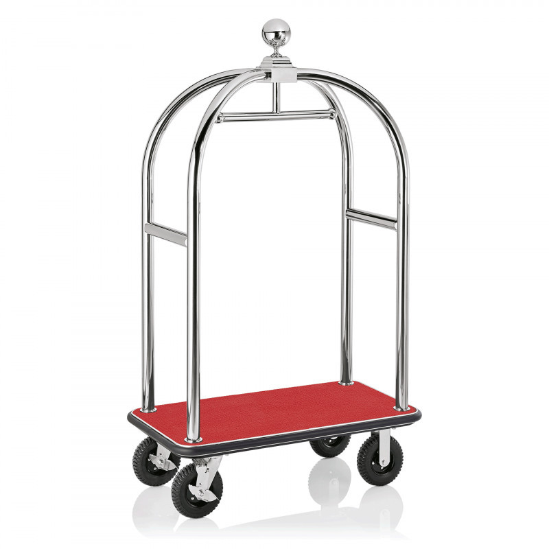 Bőröndszállító körbe gumis lökhárítóval integrált ruhatartó sínnel 5 cm-es polírozott rozsdamentes csővázzal 2 forgós fékezhető és 2 db fix 20 cm kerékkel piros szőnyeggel