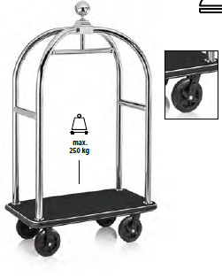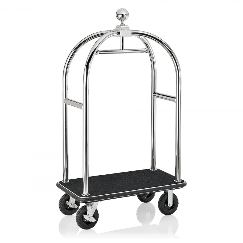 Bőröndszállító körbe gumis lökhárítóval integrált ruhatartó sínnel 5 cm-es polírozott rozsdamentes csővázzal 2 forgós fékezhető és 2 db fix 20 cm kerékkel fekete szőnyeggel
