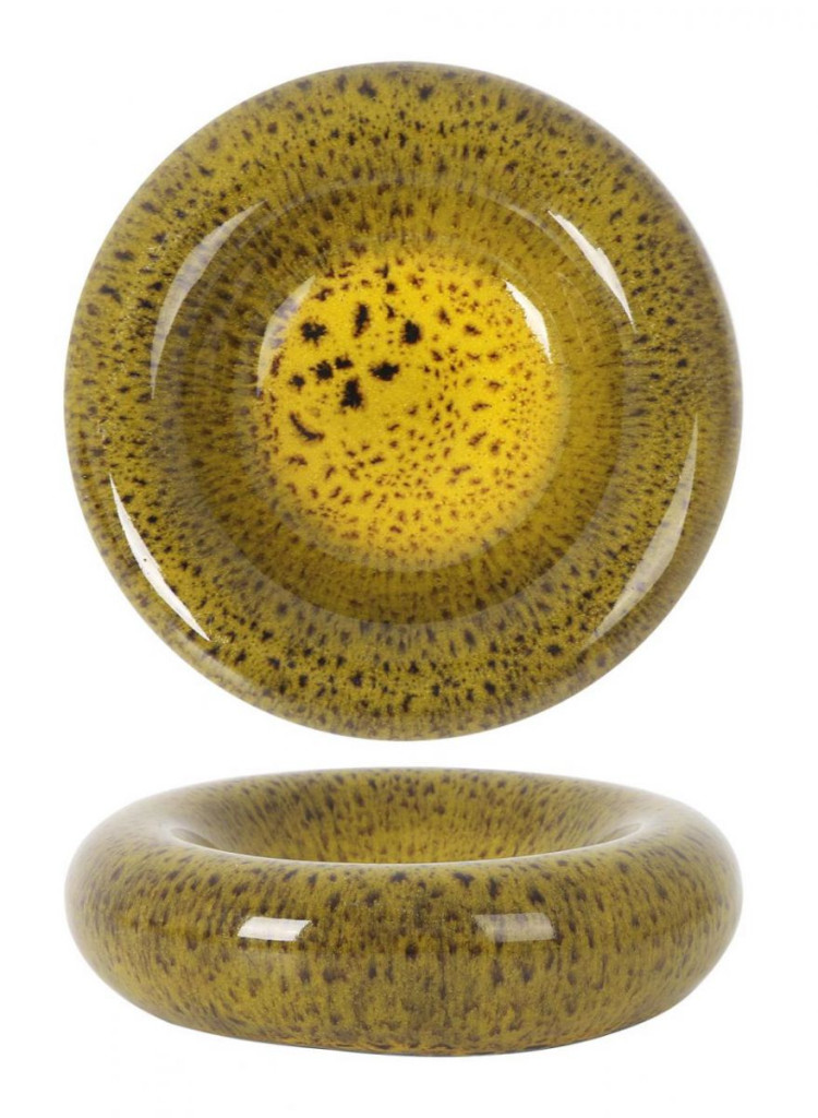 A napfénymustár szín melegséget és természetközeli karaktert áraszt, míg a pöttyözött textúra a rusztikus és modern világ határán mozog. A fészekformájú perem mély, tálaszerű kialakítást biztosít, így kisebb adagok, előételek, szószos fogások vagy desszertek számára ideális választás.