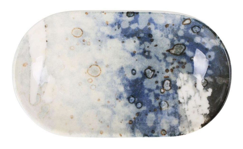 Képzeld el, ahogy ezen a kék-fehér márványhatású, ovális porcelán tányéron egy falatnyi lazactatár vagy egy apró citromtart pihen – a minta úgy keretezi, mint egy mini műalkotást. A vendég még fel sem néz, csak annyit mond: „Jöhet a következő!”