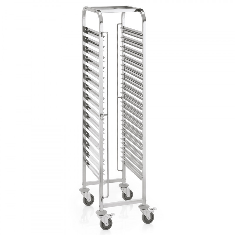 Gn 1/1-es edény tartó regálkocsi 32,5-53 cm-es belső mérettel, 15 sínpárral, biztonsági retesszel, 12 cm-es kerekekkel